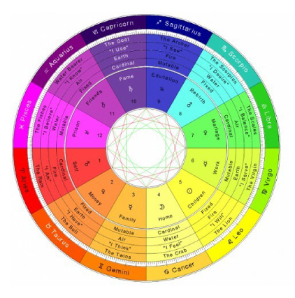 Na Mandala Astrológica calculamos os aspectos entre planetas, casas e signos, que refletem determinadas situações na sua vida. Os planetas indicam o que acontece, as casas onde acontecem e os signos como acontecem.